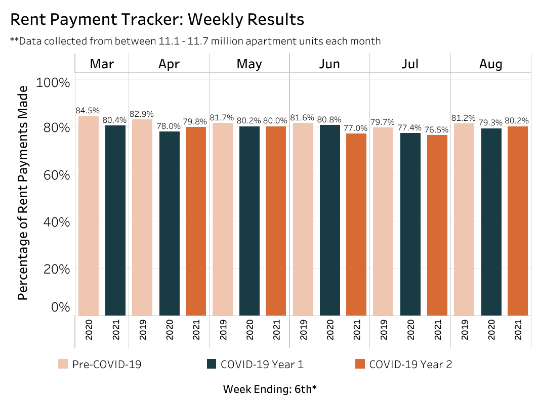 Brad Beckett posted: "The National Multifamily Housing Council (NMHC) says that 80.2% of apartment households made a full or partial rent payment by August 6th, 2021. This figure is 0.9% higher than those who paid rent through August 6, 2020. The data comes from the NMHC's R"