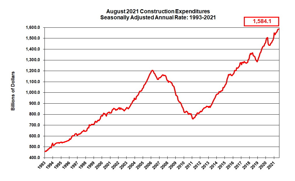 Brad Beckett posted: "The U.S. government is reporting that total construction spending in August was at a seasonally adjusted annual rate of $1,584.1 billion, which is virtually the same as July's revised estimate. However, August's figure is 8.9% higher than one year ago. "