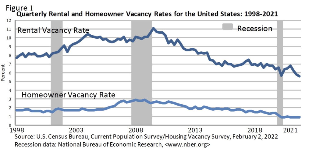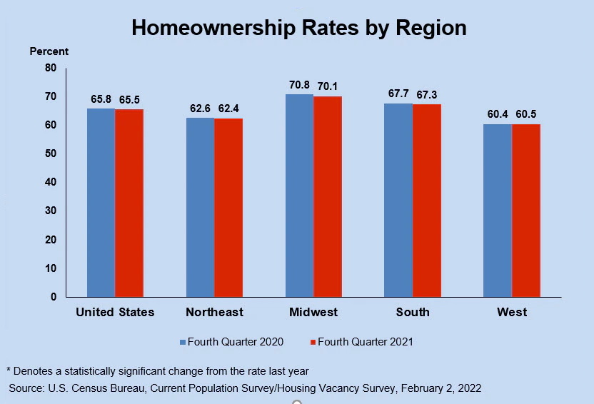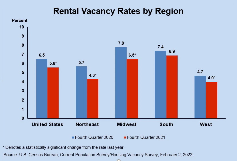 Brad Beckett posted: "The U.S. government is reporting that the national vacancy rates for Q4, 2021 were 5.6% for rental housing and 0.9% for homeowner housing. The national homeownership rate for Q4, 2021 was 65.5% (about the same as Q3). In addition, approximately 89.5% of"