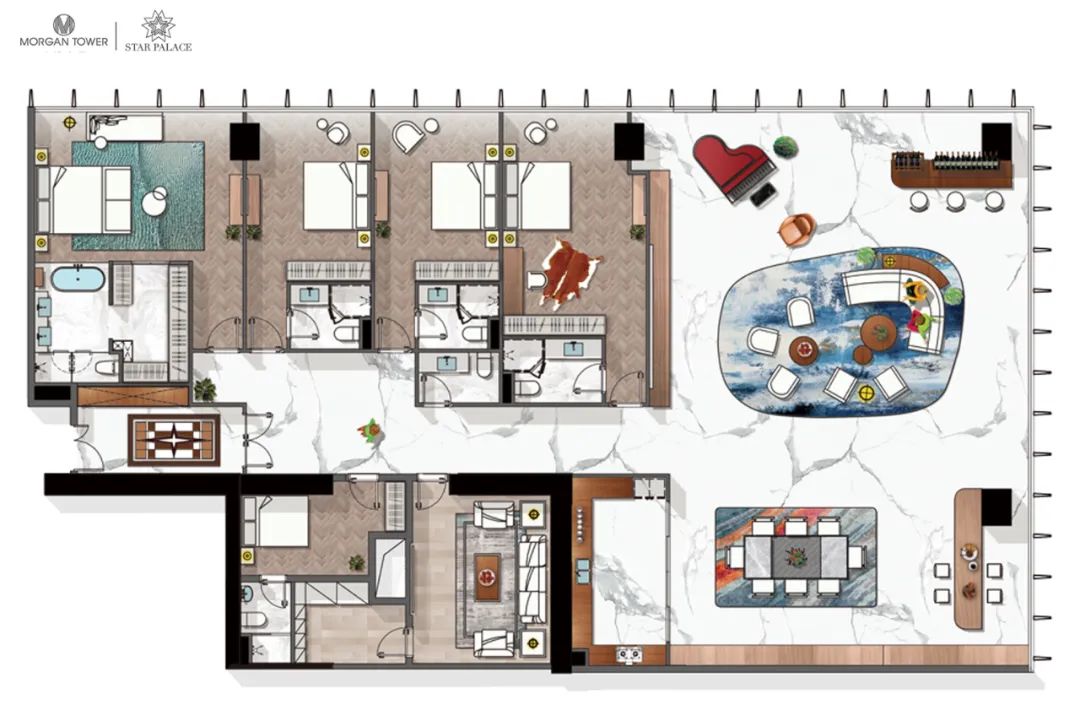 Morgan Tower Star Palace inherits the design concept of "Less is More" from Ludwig Mies Van der Rohe. The whole house adopts the frame structure without a shear wall and the design methods of asymmetry, chaining, and other design techniques to refine the design of the functional area. It connects spaces such as the parlour, dining room, private bar, and Western-style kitchen. At the same time, the decorative design is based on natural wood and Spanish marble, supplemented by champagne-coloured metal, which calmly outlines the charming personality of the owner.