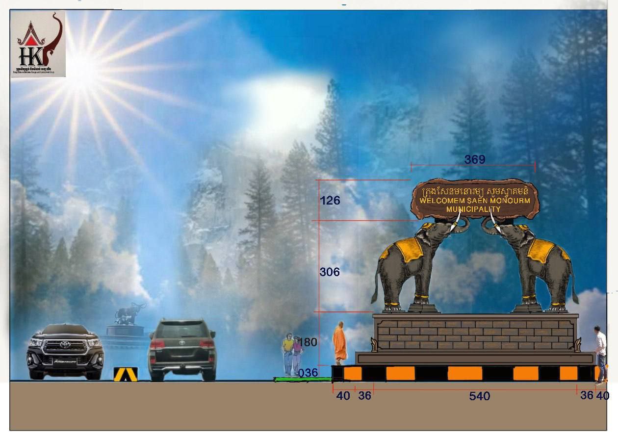 ការសាងសង់រង្វង់មូលរូបសំណាកដំរី មានទំហំផ្ទៃរង្វង់មូលចំនួន១២,៦០ម៉ែត្រ កម្ពស់ដំរី៦,៦៣ម៉ែត្រ និងកម្ពស់រូបមេទ័ព៨តឹក។ ចំំណែក រូបសំណាកដំរីក្រុងសែនមនោរម្យសូមស្វាគមន៍ ខឿនមានបណ្តោយ៧ម៉ែត្រ ទទឹម៤ម៉ែត្រ កម្ពស់ដំរី៣,០៦ម៉ែត្រ និងផ្លាកទំហំ១,២៦ម៉ែត្រ និងប្រវែង៣,៦៩ម៉ែត្រ សាងសង់ដោយក្រុមសិក្សាប្លង់ និងសំណង់ ហង់ ឃីម ប្រើរយៈពេលចំនួន៤ខែ។