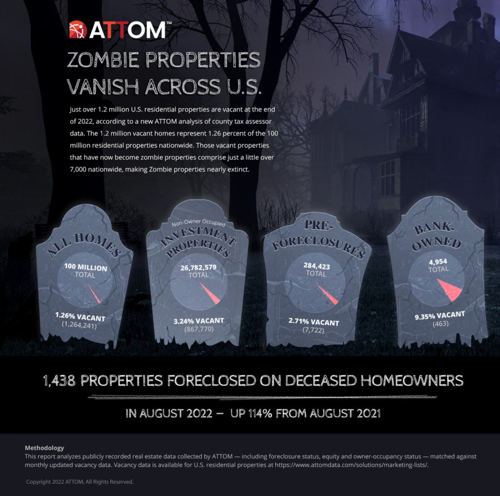 According to the ATTOM Data's Q4 2022 Vacant Property and Zombie Foreclosure Report, there were 1.3 million (1,277,162) residential properties in the United States sitting vacant, representing 1.3%, or one in 78 homes. A report also reveals that 270,470 residential properties in the U.S. are in the process of foreclosure in Q3 of this year, up 4.4% from Q2, 2022 and up 25.5% from Q3 of 2021. ATTOM says this latest increase marks the 4th straight quarter that pre-foreclosure properties have increased since a nationwide moratorium on lenders pursuing delinquent homeowners was lifted last July.